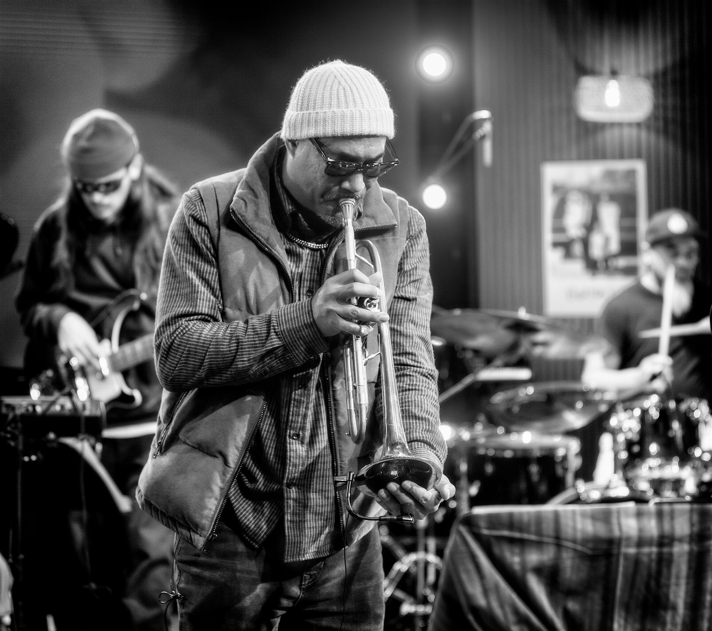 I approached this session with the photographs of Herman Leonard and Jim Marshall in mind. Their work captured musicians in the studio at the exact moment something new was being created. That was the energy I wanted to chase. The band was still shaping the sound, and the director and television crew were still figuring out how to shoot it. Everything was in motion.